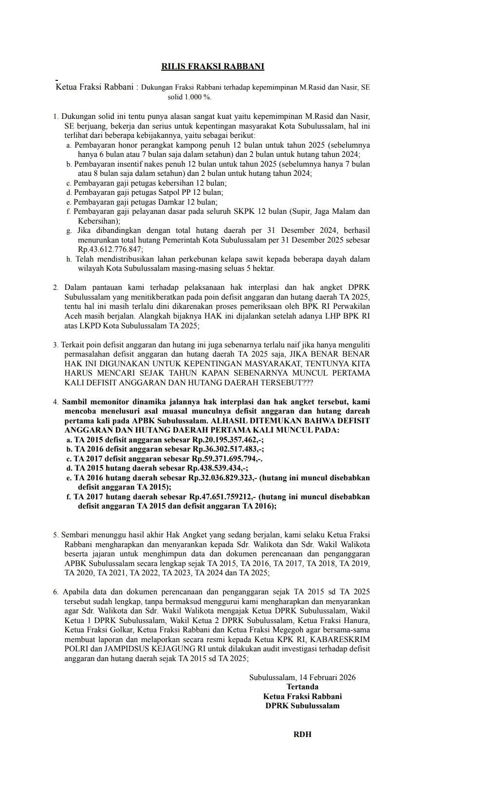 Aceh,||MediaIndonesia_Subulussalam, 14 Feb 2026, Fraksi Rabbani DPRK Subulussalam dukung 100% kepemimpinan M.Rasid dan Nasir, SE, atas kebijakan yang bermanfaat masyarakat: