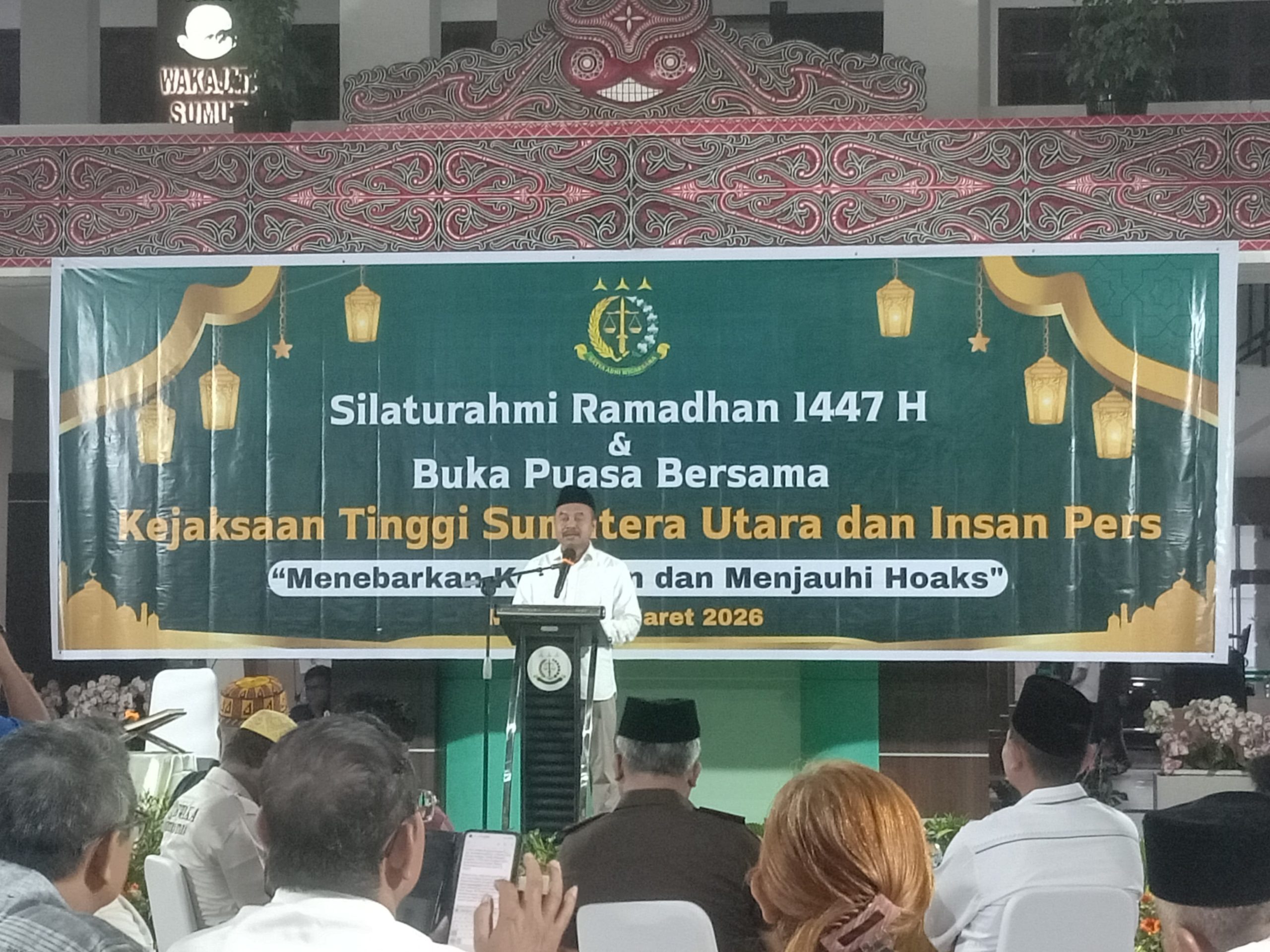 MEDAN MI.Org. Kepala Kejaksaan Tinggi (Kajati) Sumatera Utara Dr. Harli Siregar, SH, MH menggelar buka puasa bersama insan pers di aula Kantor Kejati Sumut, Jalan A.H. Nasution, Medan, Rabu (11/3/2026). Kegiatan bertema “Menebar Kebaikan dan Menjauhi Hoaks” ini dimaksudkan mempererat silaturahmi di bulan Ramadhan 1447 H.