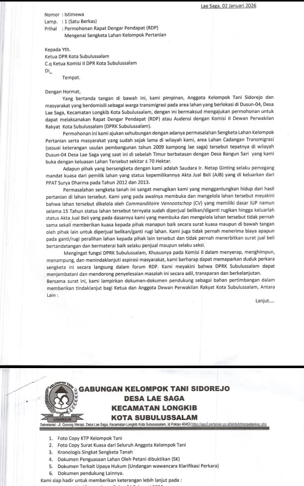 Subulusalam,Aceh||MediaIndonesia  Lae Saga, 02 Januari 2026 – Gabungan Kelompok Tani Sidorejo dari Desa Lae Saga, Kecamatan Longkib, Kota Subulussalam mengajukan Permohonan Rapat Dengan Pendapat (RDP) kepada Ketua DPRK Kota Subulussalam dan Ketua Komisi II DPRKterkait sengketa lahan pertanian seluas lebih dari 70 Hektar. Lahan tersebut berada di wilayah Dusun 04 Desa Lae Saga, berhampiran Desa Bangun Sari, dan bukan termasuk kawasan Lahan Teresebut sesuai SK.