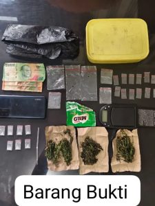 “Dari hasil penggeledahan, petugas menemukan barang bukti berupa tujuh paket narkotika diduga jenis sabu dengan berat netto 0,40 gram serta tiga paket narkotika jenis ganja dalam keadaan lembab dengan berat netto 25,09 gram. Selain itu turut diamankan 18 plastik klip kosong berles merah, satu pipet plastik yang digunakan sebagai skop, satu timbangan elektrik, uang tunai Rp30 ribu, satu plastik assoy warna hitam, satu plastik hijau bertuliskan Milo, satu unit handphone Android merek OPPO warna biru, serta satu rantang plastik warna kuning.